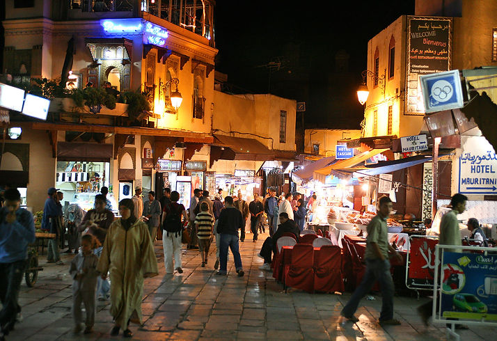 Fes eignet sich nicht für einen oberflächlichen Besuch. Die Stadt will erobert werden. Als Ausgangspunkt eignen sich dafür am besten die innerhalb der Stadtmauern gelegenen Riadhotels. Einheimische und ausländische Investoren nehmen sich seit einigen Jahren der zahlreichen, zum Teil arg heruntergekommenen Paläste und Herrschaftshäuser an, um sie liebevoll zu kleinen, aber feinen Privathotels umzubauen. Die Palette der mehr als 40 Riads reicht inzwischen von der gediegenden Luxusunterkunft bis zum familiären Privathotel. In dieser Atmosphäre aus Tausendundeiner Nacht lassen sich die Eindrücke und Erlebnisse des Tages vorzüglich verarbeiten. Unter sternenklarem Himmel kann man von der obligatorischen Dachterrasse aus bei einem The de menthe einen beeindruckenden Panoramablick über Fes el Bali genießen. Die Gastgeber helfen gern, Sitten und Gebräuche zu verstehen, unbekannte Preise kennenzulernen und vor allem einen Weg durch das Gassenlabyrinth der mittlerweile rund 600 000 Einwohner zählenden Medina zu finden. Wenn in den Souks die Lichter angehen, der Muezzin zum Abendgebet ruft und sich die brütende Hitze des Tages gemildert hat, beginnt die Zeit der Flaneure. Die Straßencafés, meist unweit der Stadttore gelegen, füllen sich. Garküchen locken mit duftendem Kuskus und Tajine, dem marokkanischen Eintopf. Die Händler verschließen gewissenhaft die hölzernen Klappläden ihrer Buden – Stille macht sich breit. So war es immer schon, und so wird es immer bleiben.